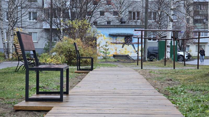 В этом году во дворе дома на пр. Ломоносова, 282/1 на месте пустыря создали спортивную площадку с искусственной травой и турниками. А для спокойного отдыха установили скамейки, cмонтировали стильную деревянную дорожку к ним.