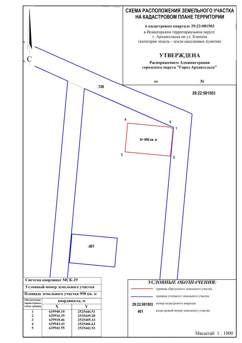 Департамент градостроительства Администрации городского округа "Город Архангельск" извещает о возможности предоставления земельного участка, расположенного в Исакогорском территориальном округе г. Архангельска по ул. Клепача площадью 998 кв. м, для индивидуального жилищного строительства согласно представленной схеме расположения земельного участка.